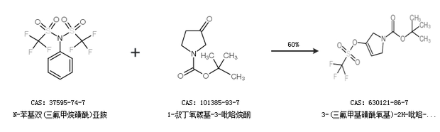 2.通过N-苯基双(三氟甲烷磺酰)亚胺和1-叔丁氧碳基-3-吡咯烷酮合成3-(三氟甲基磺酰氧基)-2H-吡咯-1(5h)-羧酸叔丁酯,收率约60%;