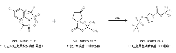 1.通过2-[N,正双(三氟甲烷烷磺酰)氨基]-5-氯吡啶和1-叔丁氧碳基-3-吡咯烷酮合成3-(三氟甲基磺酰氧基)-2H-吡咯-1(5h)-羧酸叔丁酯,收率约33%;