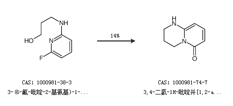 1.通过3-(6-氟-吡啶-2-基氨基)-1-丙醇合成3,4-二氢-1H-吡啶并[1,2-a]嘧啶-6(2H)-酮,收率约14%;