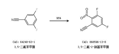1.通过3,5-二氟苯甲腈合成3,5-二氟-2-硝基苯甲腈,收率约95%;