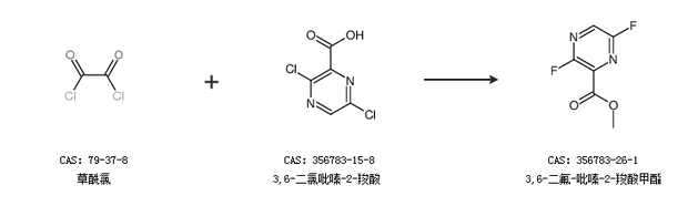 2.通过草酰氯和3,6-二氯吡嗪-2-羧酸合成3,6-二氟-吡嗪-2-羧酸甲酯