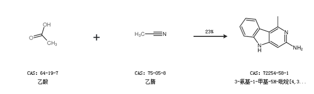 2.通过乙酸和乙腈合成3-氨基-1-甲基-5H-吡啶[4,3-b]吲哚,收率约23%;