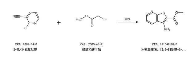 1.通过2-氯-3-氰基吡啶和巯基乙酸甲酯合成3-氨基噻吩并[2,3-B]吡啶-2-甲酸乙酯,收率约90%;