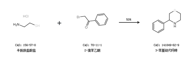 1.通过半胱胺盐酸盐和2-溴苯乙酮合成3-苯基硫代吗啉,收率约50%;