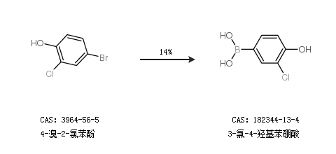 1.通过4-溴-2-氯苯酚合成3-氯-4-羟基苯硼酸,收率约14%;