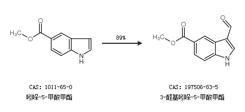 2.通过吲哚-5-甲酸甲酯合成3-醛基吲哚-5-甲酸甲酯,收率约89%;