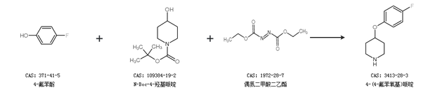 1.通过4-氟苯酚、N-Boc-4-羟基哌啶和偶氮二甲酸二乙酯合成4-(4-氟苯氧基)哌啶