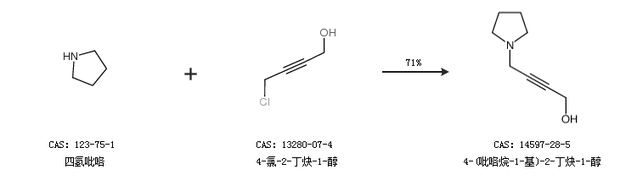 1.通过四氢吡咯和4-氯-2-丁炔-1-醇合成4-(吡咯烷-1-基)-2-丁炔-1-醇,收率约71%;