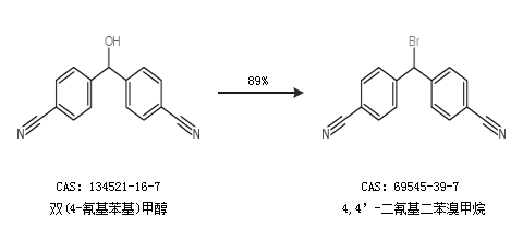 1.通过双(4-氰基苯基)甲醇合成4,4’-二氰基二苯溴甲烷,收率约89%;