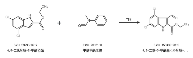 2.通过4,6-二氯吲哚-2-甲酸乙酯和甲基甲酰苯胺合成4,6-二氯-3-甲酰基-1H-吲哚-2-甲酸乙酯,收率约75%;