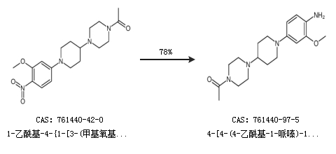 1.通过1-乙酰基-4-{1-[3-(甲基氧基)-4-硝基苯基]-4-哌啶基}哌嗪合成4-[4-(4-乙酰基-1-哌嗪)-1-哌啶基]-2-(甲基氧基)苯胺,收率约78%;