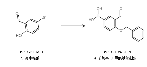 2.通过5-溴水杨醛合成4-苄氧基-3-甲酰基苯硼酸
