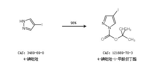 1.通过4-碘吡唑合成4-碘吡唑-1-甲酸叔丁酯,收率约98%;