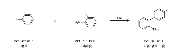 2.通过氟苯和2-碘苯胺合成4-氟-联苯-2-胺,收率约53%;
