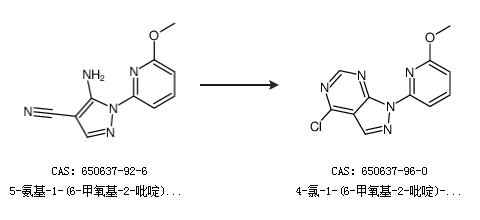 1.通过5-氨基-1-(6-甲氧基-2-吡啶)-1H-吡唑-4-甲腈合成4-氯-1-(6-甲氧基-2-吡啶)-1H-吡唑并[3,4-d]嘧啶