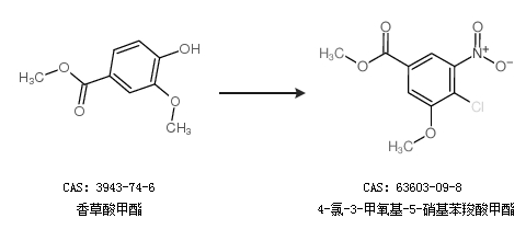 2.通过香草酸甲酯合成4-氯-3-甲氧基-5-硝基苯羧酸甲酯