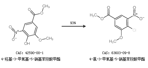 1.通过4-羟基-3-甲氧基-5-硝基苯羧酸甲酯合成4-氯-3-甲氧基-5-硝基苯羧酸甲酯,收率约93%;