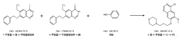 1.通过7-苄氧基-4-氯-6-甲氧基喹唑啉、6-甲氧基-7-苄氧基喹唑啉-4-酮和苯酚合成4-氯-6-甲氧基-7-[3-(4-吗啉)丙氧基]喹唑啉