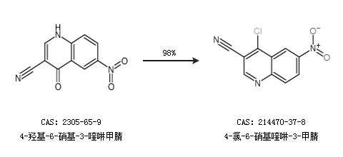 2.通过4-羟基-6-硝基-3-喹啉甲腈合成4-氯-6-硝基喹啉-3-甲腈,收率约98%;