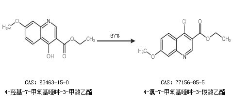 1.通过4-羟基-7-甲氧基喹啉-3-甲酸乙酯合成4-氯-7-甲氧基喹啉-3-羧酸乙酯,收率约67%;