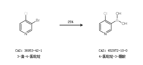 2.通过3-溴-4-氯吡啶合成4-氯吡啶-3-硼酸,收率约25%;