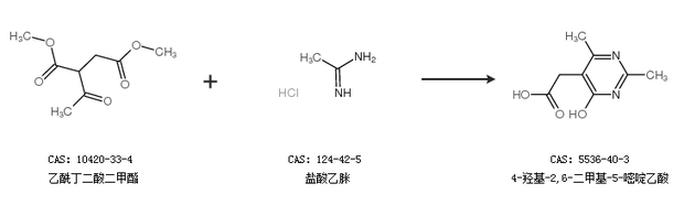 1.通过乙酰丁二酸二甲酯和盐酸乙脒合成4-羟基-2,6-二甲基-5-嘧啶乙酸