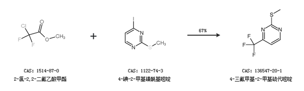 1.通过2-氯-2,2-二氟乙酸甲酯和4-碘-2-甲基磺酰基嘧啶合成4-三氟甲基-2-甲基硫代嘧啶,收率约67%;