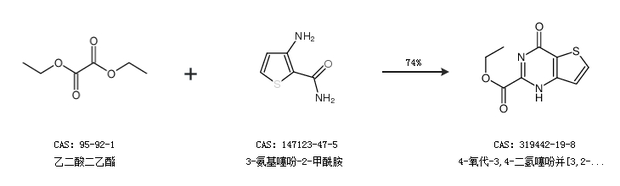 1.通过乙二酸二乙酯和3-氨基噻吩-2-甲酰胺合成4-氧代-3,4-二氢噻吩并[3,2-d]嘧啶-2-羧酸乙酯,收率约74%;