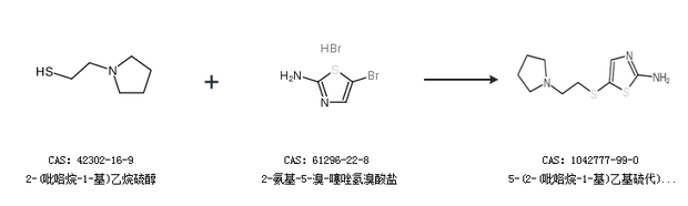 1.通过2-(吡咯烷-1-基)乙烷硫醇和2-氨基-5-溴-噻唑氢溴酸盐合成5-(2-(吡咯烷-1-基)乙基硫代)噻唑-2-胺