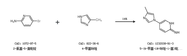 2.通过2-氨基-5-溴吡啶和4-甲基咪唑合成5-(4-甲基-1H-咪唑-1-基)吡啶-2-胺,收率约14%;