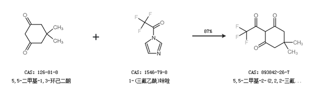 1.通过5,5-二甲基-1,3-环己二酮和1-(三氟乙酰)咪唑合成5,5-二甲基-2-(2,2,2-三氟乙酰基)环己烷-1,3-二酮,收率约87%;