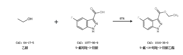 1.通过乙醇和5-氟吲唑-3-羧酸合成5-氟-1H-吲唑-3-羧酸乙酯,收率约87%;