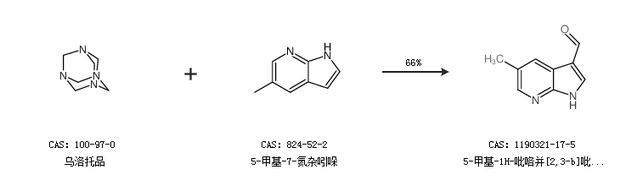 1.通过乌洛托品和5-甲基-7-氮杂吲哚合成5-甲基-1H-吡咯并[2,3-b]吡啶-3-甲醛,收率约66%;