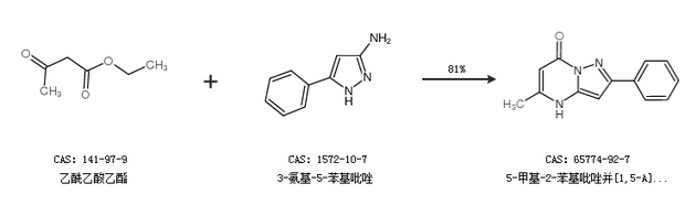 1.通过乙酰乙酸乙酯和3-氨基-5-苯基吡唑合成5-甲基-2-苯基吡唑并[1,5-A]嘧啶-7(4H)-酮,收率约81%;