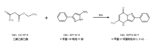2.通过乙酰乙酸乙酯和3-苯基-1H-吡唑-5-胺合成5-甲基-2-苯基吡唑并[1,5-A]嘧啶-7(4H)-酮,收率约92%;