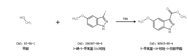 1.通过甲醇和3-碘-5-甲氧基(1h)吲唑合成5-甲氧基-1H-吲唑-3-羧酸甲酯,收率约79%;