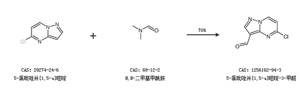1.通过5-氯吡唑并[1,5-a]嘧啶和N,N-二甲基甲酰胺合成5-氯吡唑并[1,5-a]嘧啶-3-甲醛,收率约70%;