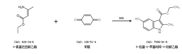 2.通过3-氨基巴豆酸乙酯和苯醌合成5-羟基-2-甲基吲哚-3-羧酸乙酯,收率约88%;