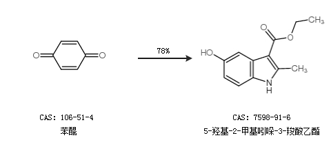 1.通过苯醌合成5-羟基-2-甲基吲哚-3-羧酸乙酯,收率约78%;