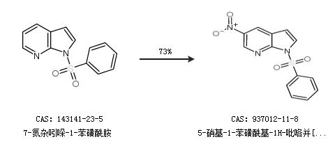 1.通过7-氮杂吲哚-1-苯磺酰胺合成5-硝基-1-苯磺酰基-1H-吡咯并[2,3-b]吡啶,收率约73%;