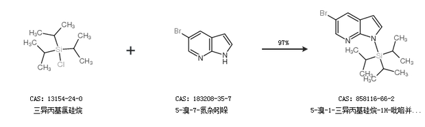 2.通过三异丙基氯硅烷和5-溴-7-氮杂吲哚合成5-溴-1-三异丙基硅烷-1H-吡咯并[2,3-b]吡啶,收率约97%;