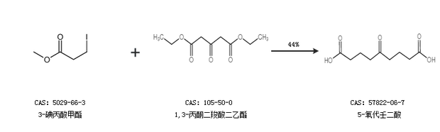 1.通过3-碘丙酸甲酯和1,3-丙酮二羧酸二乙酯合成5-氧代壬二酸,收率约44%;