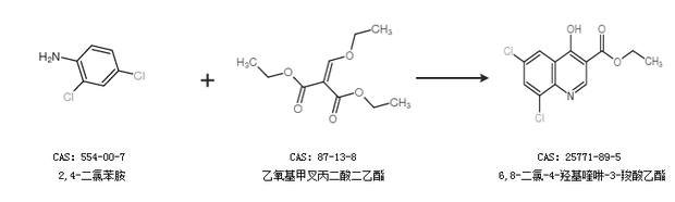 1.通过2,4-二氯苯胺和乙氧基甲叉丙二酸二乙酯合成6,8-二氯-4-羟基喹啉-3-羧酸乙酯