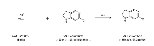 1.通过甲醇钠和6-氯-2,3-二氢-1H-吡咯并[3,2-c]吡啶合成6-甲氧基-5-氮杂吲哚啉,收率约45%;