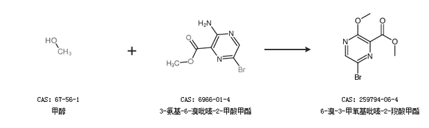 2.通过甲醇和3-氨基-6-溴吡嗪-2-甲酸甲酯合成6-溴-3-甲氧基吡嗪-2-羧酸甲酯