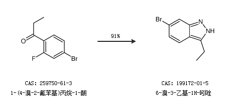 1.通过1-(4-溴-2-氟苯基)丙烷-1-酮合成6-溴-3-乙基-1H-吲唑,收率约91%;