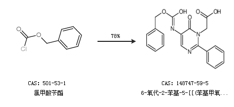 2.通过氯甲酸苄酯合成6-氧代-2-苯基-5-[[(苯基甲氧基)羰基]氨基]-1(6h)-嘧啶乙酸,收率约78%;