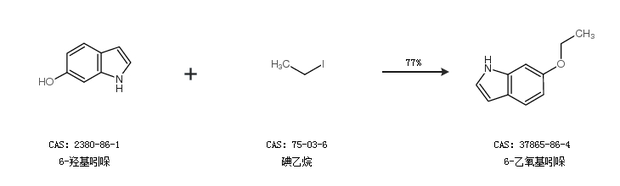 1.通过6-羟基吲哚和碘乙烷合成6-乙氧基吲哚,收率约77%;