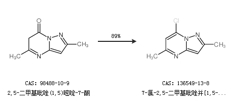 2.通过2,5-二甲基吡唑(1,5)嘧啶-7-酮合成7-氯-2,5-二甲基吡唑并[1,5-a]嘧啶,收率约89%;