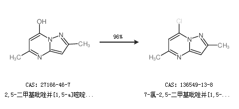 1.通过2,5-二甲基吡唑并[1,5-a]嘧啶-7-醇合成7-氯-2,5-二甲基吡唑并[1,5-a]嘧啶,收率约96%;